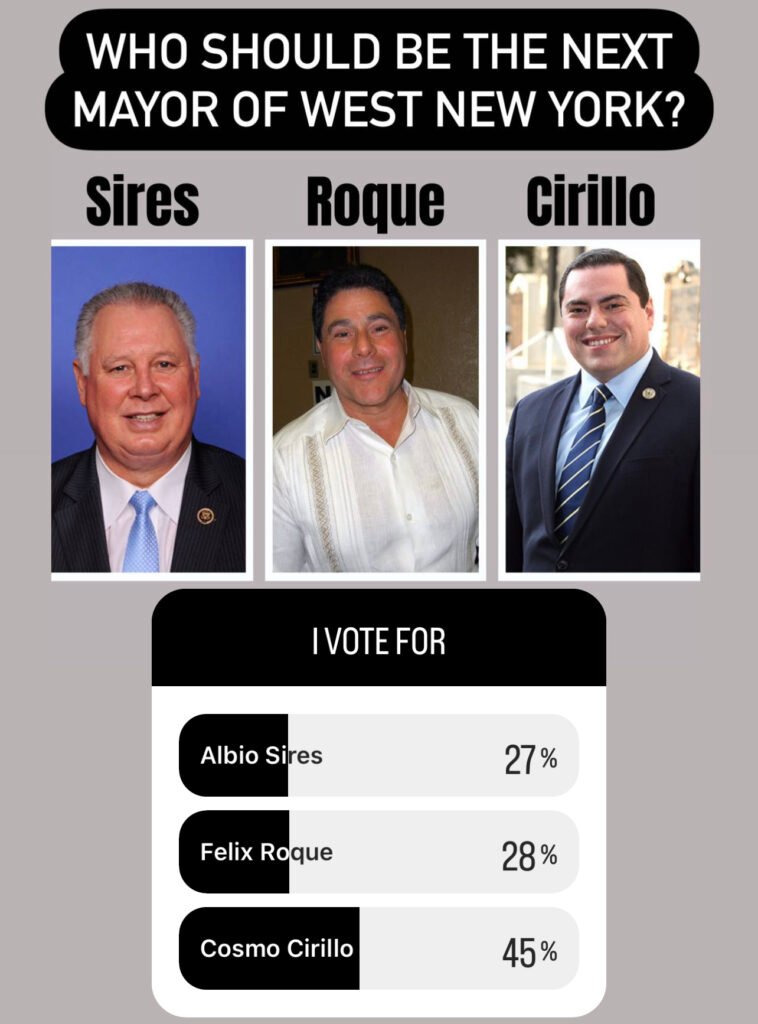 Cirillo beat Sires 45% to 27% in an Instagram poll held by HudPost. (2870 accounts participated in the poll.)