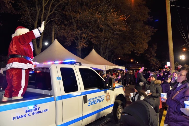 Santa Claus rode into Braddock Park on Wednesday, Nov 28, 2018 not on a sleigh pulled by reindeer but on a Hudson County Sheriff’s vehicle, waving to the revelers who came for the 2nd annual holiday tree lighting.
