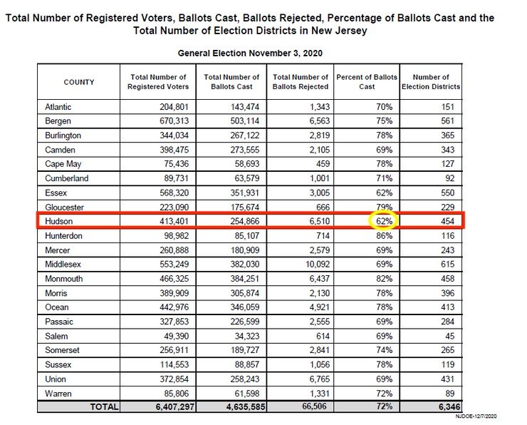 Of the 413,000+ registered voters in Hudson County, only 62% (254,866) voted in the general election. Also 6,510 ballots were rejected….