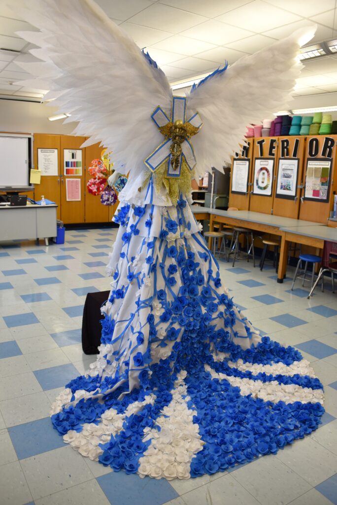 Made by students C.J. King and Jazzlyn Vargas, with help from their instructors, art teacher Steven Defendini and fashion teacher Marlene Sapoff, as well as previous graduates Josselyn Garcia and Iman Jaludi, the dress was constructed using clean, recycled blue sterilization wrap, the material that surgical devices are wrapped in (sourced from Hackensack University Medical Center) and honors the nurses and medical professionals who toiled tirelessly through the past few years of pandemic.