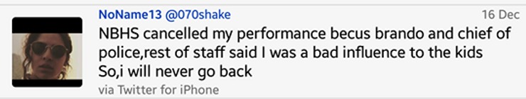 On December 16th, North Bergen artist, 070 Shake, tweeted about her North Bergen High School performance being canceled by the staff, Vice Principal Ms. Patricia Brando, and North Bergen Chief of Police Robert Dowd.