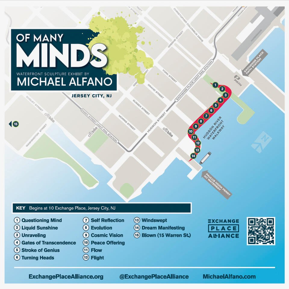 On March 28, 2024, the Hudson River Waterfront Walkway in Jersey City became the new home for “Of Many Minds,” a sculpture exhibit by artist Michael Alfano. Sponsored by the Exchange Place Alliance, this captivating display stretches from the Exchange Place PATH Station to the Paulus Hook ferry terminal and features 15 unique sculptures.