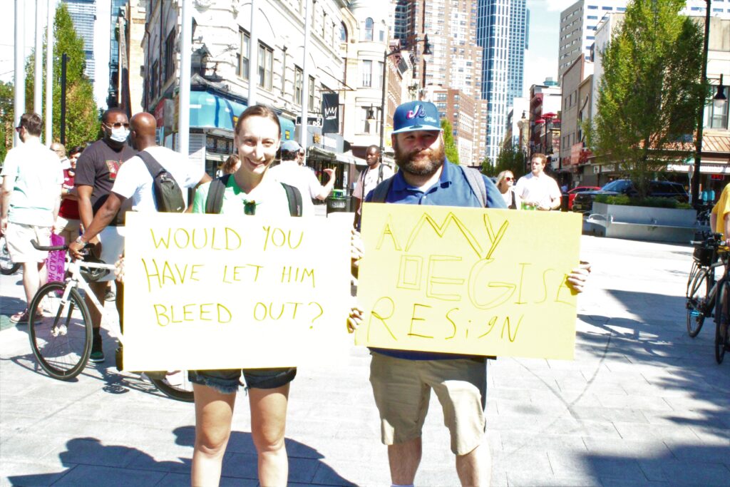 Andrew Black, the victim of the hit-and-run incident, was at the protest. “I’m not out here seeking a vendetta or any of that,” says Black. “All I am seeking is justice. And how we get justice is right here.”