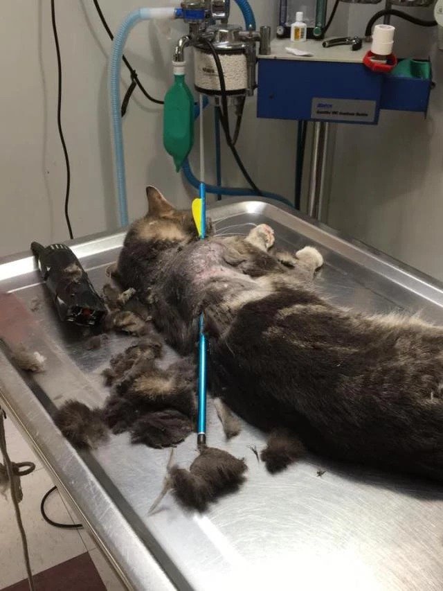 On Thursday morning Kelly Shannon went out to feed a few friendly neighborhood feral cats, just like she always does before work every day. Imagine her horror and surprise when she found one of her favorites, a sweet, gentle male named Sparky, wounded with an arrow.