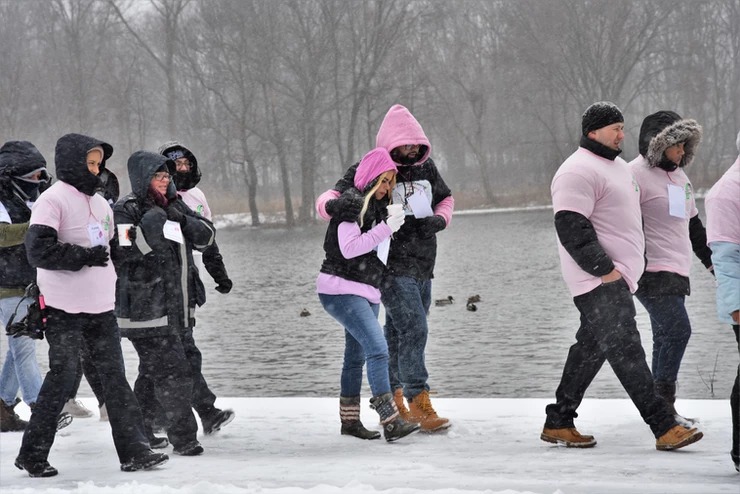 A large group of volunteers and supporters braved the snowstorm on Tuesday, Feb. 12, 2019 to gather at lakeside in Braddock Park and observe a moment of silence at 10:41, the time when Nevaeh Hernandez “became an angel,” in her grandmother’s words. The group then walked around the perimeter of the frozen lake.