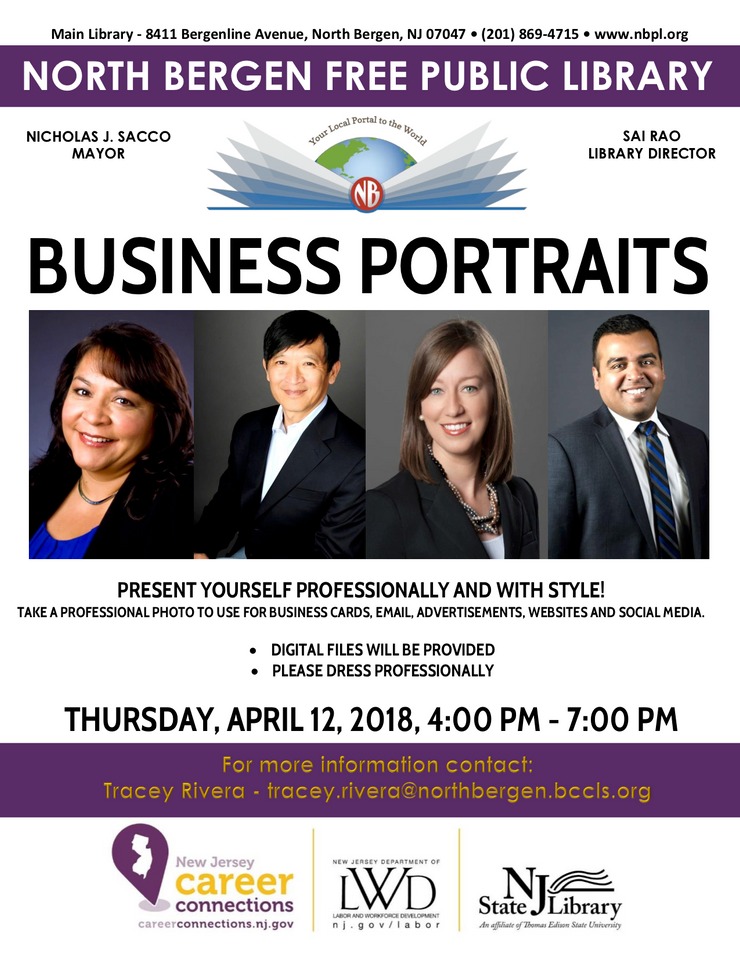 Business portraits will be taken from 4 to 7 p.m. on Thursday, April 12, 2018 at the main library, 8411 Bergenline Ave. Digital files will be provided. For more information contact tracey.rivera@northbergen.bccls.org
